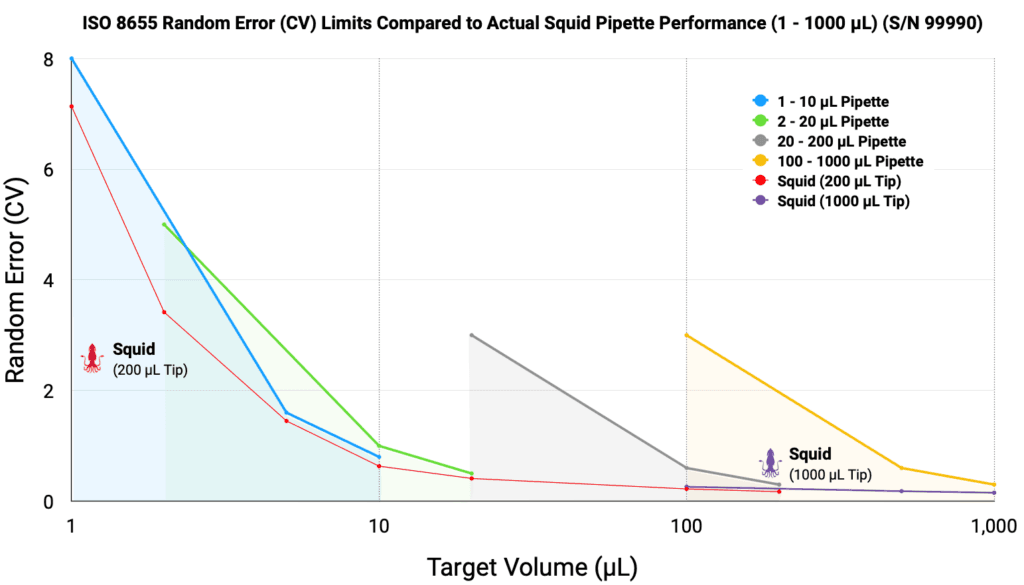 Figure 1. Random Error (CV) comparison between the Squid Pipette (S/N 99990) and ISO 8655 permissible limits. The Squid Pipette demonstrates superior precision across the entire 1 – 1000 µL range, consistently performing well below the maximum allowable limits for standard air-displacement pipettes.