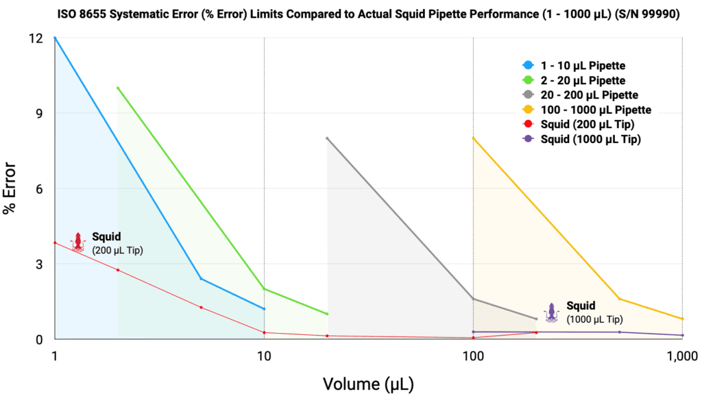 Figure 2. Systematic Error (% Error) of the Squid Pipette (S/N 99990) compared to ISO 8655:2022 permissible limits. The Squid performance (red and purple lines) remains consistently below the maximum allowable limits across all volumes, demonstrating superior accuracy. The overlapping data points at 100 µL and 200 µL illustrate the seamless transition and maintained performance between the 200 µL and 1000 µL tip types.